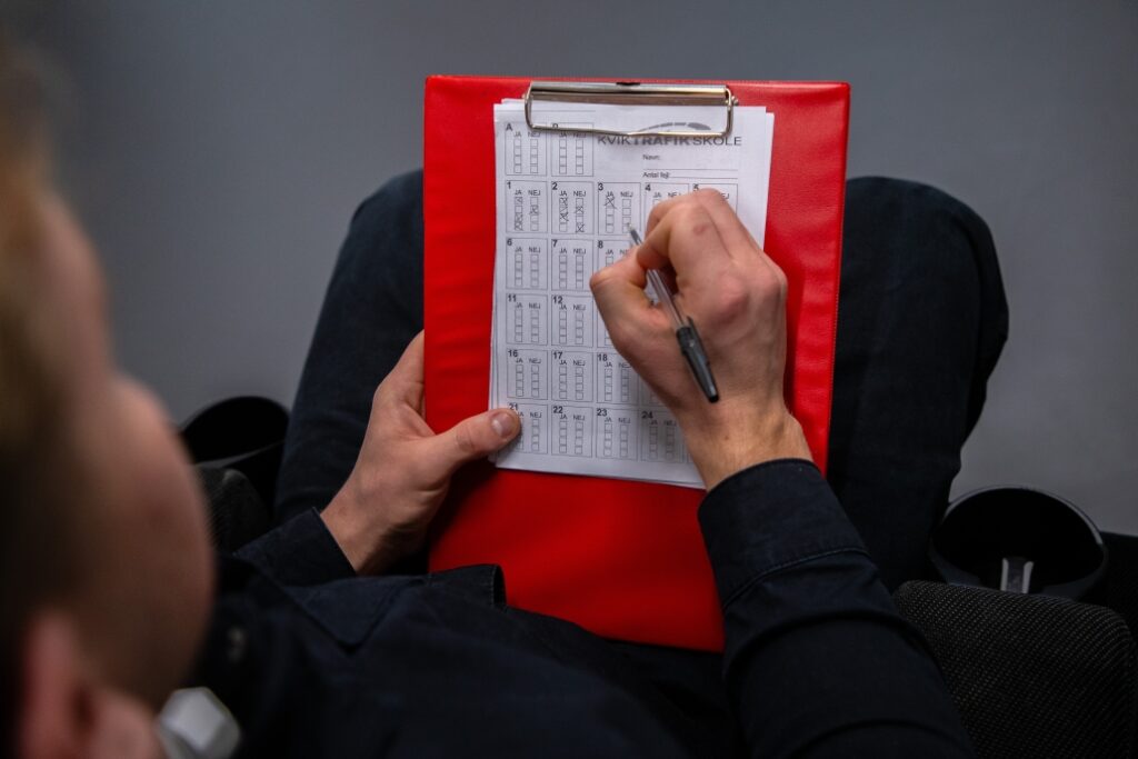 Umiddelbart efter teoriprøven vil den prøvesagkyndige meddele resultatet og aflevere et bedømmelsesskema.